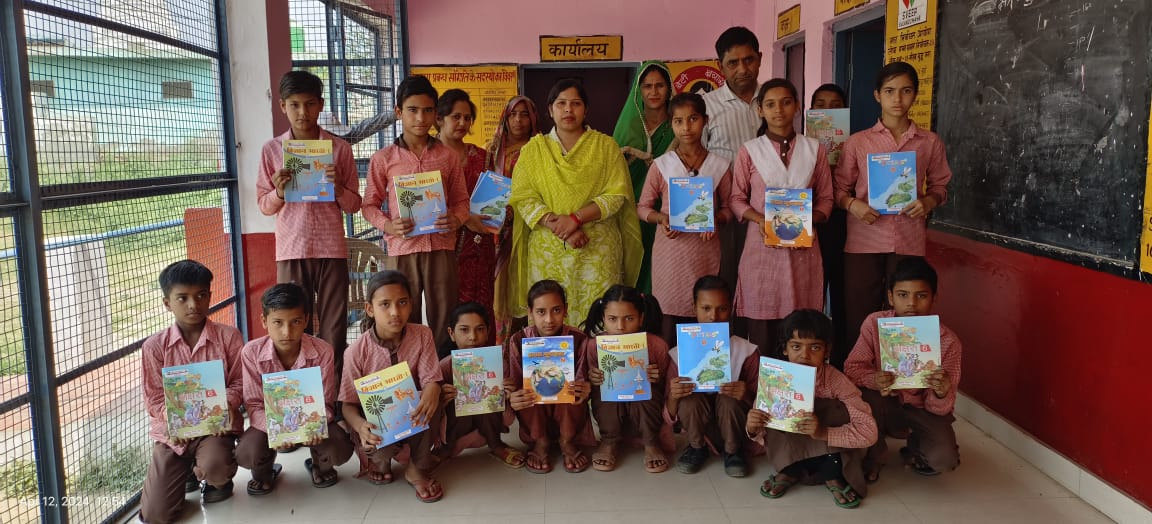 पुस्तक मिलते ही खिल उठे बच्चों के चेहरे।