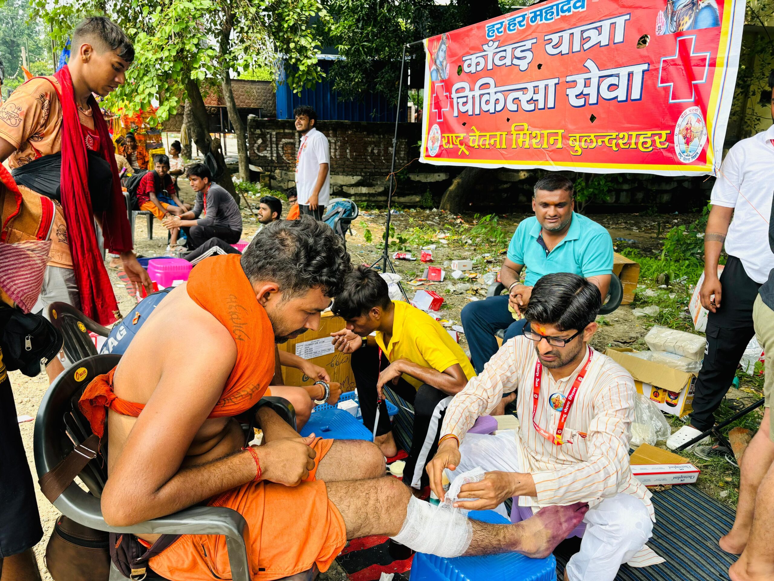 बुलंदशहर। ।भारत पुष्प। श्रावण मास की कांवड़ यात्रा मार्ग पर हरिद्वार की ओर से पवित्र गंगा जल लेकर पैदल यात्रा कर रहे शिवभक्तों की राष्ट्र चेतना मिशन द्वारा चिकित्सा सेवा लगातार जारी है। हरिद्वार, रुड़की, मुजफ्फरनगर, खतौली, मेरठ और हापुड़ के उपरांत अब बुलंदशहर जिले के विभिन्न क्षेत्रों में कार्यकर्ता सेवा प्रदान कर रहे हैं। संस्था द्वारा 10 साल से निरंतर संचालित चिकित्सा सेवा के क्रम में इस वर्ष के अभियान के पांचवे दिन बुधवार को भी बुलंदशहर से गुलावठी रोड, स्याना रोड, मामन रोड, खुर्जा रोड आदि क्षेत्रों के विभिन्न स्थानों पर हजारों कांवड़ियों का उपचार किया।