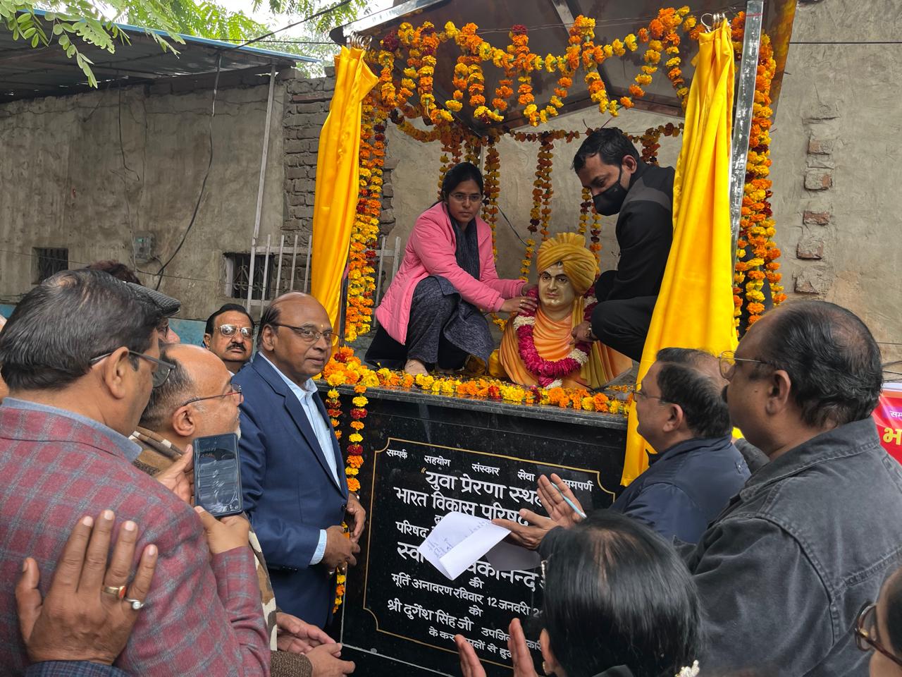 खुर्जा। ।भारत पुष्प। भारत विकास परिषद खुर्जा द्वारा खुर्जा तहसील प्रांगण में स्थापित की गई परिषद के आदर्श युग पुरुष स्वामी विवेकानंद जी की मूर्ति का अनावरण युवा प्रेरणा स्थल के नाम से चंद्रप्रकाश पांडे तहसीलदार खुर्जा नेहा गुप्ता नायब तहसीलदार ने किया इस अवसर पर बोलते हुए उन्होंने स्वामी विवेकानंद जी को विश्व में भारतीय संस्कृति का प्रस्तुत करने युवाओं के प्रेरणा स्रोत बताया स्वामी जी के आदर्श के बारे में बोलते हुए संगति आप को ऊंचा उठा भी सकती है और यह आप की ऊंचाई से गिरा भी सकती है। राष्ट्र चेतना मिशन चेतन बिस्मिल जी ने भक्ति संगीत का कार्यक्रम प्रस्तुत किया। पूर्व विधायक हरपाल सिंह ने भारत विकास परिषद की उत्कृष्ट कार्य की सराहना करते हुए स्वामी विवेकानंद जी द्वारा दिए गए जीवन के परम लक्ष्य जो हमें दिया है उठो, जागो और तब तक मत रुको जब तक लक्ष्य की प्राप्ति ना हो जाए। भारत विकास परिषद के पश्चिम उत्तर प्रदेश के प्रांतीय अध्यक्ष नरेंद्र कुमार शर्मा ने स्वामी जी के अनमोल शब्दों को तुम्हें कोई पढ़ा नहीं सकता, कोई आध्यात्मिक नहीं बना सकता सब कुछ खोने से ज्यादा बुरा उस उम्मीद को खो देना जिसके भरोसे हम सब कुछ वापस पा सकते हैं।स्वामी विवेकानंद की 4 शिक्षाएं अलौकिक दृष्टि से शिक्षा के सम्बन्ध में उन्होंने कहा है कि ‘हमें ऐसी शिक्षा चाहिए, जिससे चरित्र का गठन है। भारत विकास परिषद द्वारा आयोजित इस कार्यक्रम का प्रारंभ वंदे मातरम से दीप प्रचलन से हुआ। कार्यक्रम में संयोजक विकास गोयल, अजय कुमार गर्ग एडवोकेट सुनील आदर्श अध्यक्ष प्रेम प्रकाश अरोरा सचिव पीयूष तायल कोषाध्यक्ष कृष्ण अवतार के अलावा इन्द्रजीत सिंह दुग्गल राजेंद्र अग्रवाल चंद्रप्रकाश तायल राकेश आर्य राहुल राठी विवेक अग्रवाल शलभ पांडे सुशील प्रकाश अनिल अग्रवाल अजीत मित्तल राजीव वर्मा अनिल गुप्ता महेश चौधरी लोकेश जिंदल महेश पौद्दार विनीत आर्य आशीष वारशनेय मुकेश रूहेला कुशाग्र अग्रवाल अनिल गुप्ता कपिल मित्तल गोपाल सर्राफ विकास ओयल विपिन गोयल आदि मौजूद रहे।