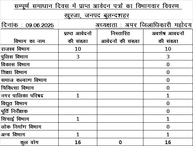 खुर्जा। ।भारत पुष्प। नगर की नई तहसील पर सोमवार को सम्पूर्ण समाधान दिवस का आयोजन किया गया। जिसकी अध्यक्षता अपर जिलाधिकारी द्वारा की गई। एसडीएम प्रतीक्षा पांडे ने बताया कि सम्पूर्ण समाधान दिवस में राजस्व विभाग की 10 पुलिस विभाग की 03 नगर पालिका की 01 सिंचाई विभाग व अन्य में 01–01 शिकायतें प्राप्त हुईं। इस प्रकार सम्पूर्ण समाधान दिवस में कुल 16 शिकायतें प्राप्त हुईं। जिसमें से एक का भी निस्तारण मौके पर नहीं हो सका जिसके चलते सभी शिकायतें उनके विभागों को निस्तारण के लिए भेजी गयी हैं।
