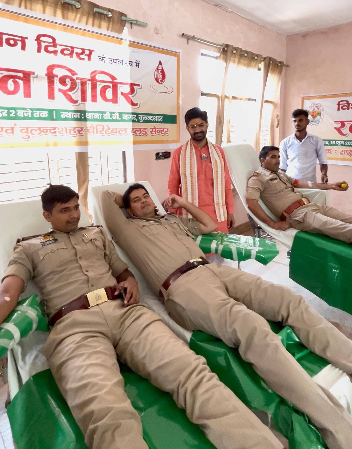बुलंदशहर। ।भारत पुष्प। विश्व रक्तदाता दिवस के उपलक्ष्य में राष्ट्र चेतना मिशन द्वारा आयोजित रक्तदान शिविर में बड़ी संख्या में लोगों ने उत्साहपूर्वक भाग लिया। जरूरतमंद मरीजों की सहायतार्थ एक दर्जन पुलिसकर्मियों सहित कुल 28 लोगों ने सहर्ष रक्तदान किया। रक्तदान के प्रति जागरूकता और योगदान के उद्देश्य से जिले के थाना बीबी नगर परिसर में आयोजित हुए रक्तदान शिविर में कार्यक्रम के मुख्य संयोजक वरिष्ठ उपनिरीक्षक विनोद अहलावत ने सबसे पहले स्वयं रक्तदान कर सभी को प्रेरित किया। उसके बाद थाने में कार्यरत सभी दरोगा और कई आरक्षियों सहित अन्य कर्मचारियों ने भी उत्साहपूर्वक रक्तदान किया। पुलिसकर्मियों के अलावा विभिन्न सामाजिक संगठनों के गणमान्य लोगों ने भी रक्तदान कर जीवन रक्षा के इस महान अभियान में योगदान दिया। राष्ट्र चेतना मिशन के अध्यक्ष हेमन्त सिंह एवं बुलंदशहर चैरिटेबल ब्लड सेंटर के मैनेजर विशाल त्यागी ने सभी रक्तदाताओं को प्रशस्ति पत्र एवं उपहार भेंट कर उनका अभिनंदन व आभार व्यक्त किया। राष्ट्रीय स्वयंसेवक संघ के विभाग सामाजिक समरसता प्रमुख महेन्द्र सिंह, एसएसआई विनोद अहलावत, एसआई शुभम गंगवाल, एसआई प्रमोद कुमार, एसआई विशाल मलिक, प्रवीण कुमार, दीपक कुमार, रोहित सागर, शुभित अग्रवाल, पंकज गुप्ता, पंपोश रघुवंशी, ललित कुमार, विजय शर्मा, अमित मलिक आदि ने रक्तदान किया।