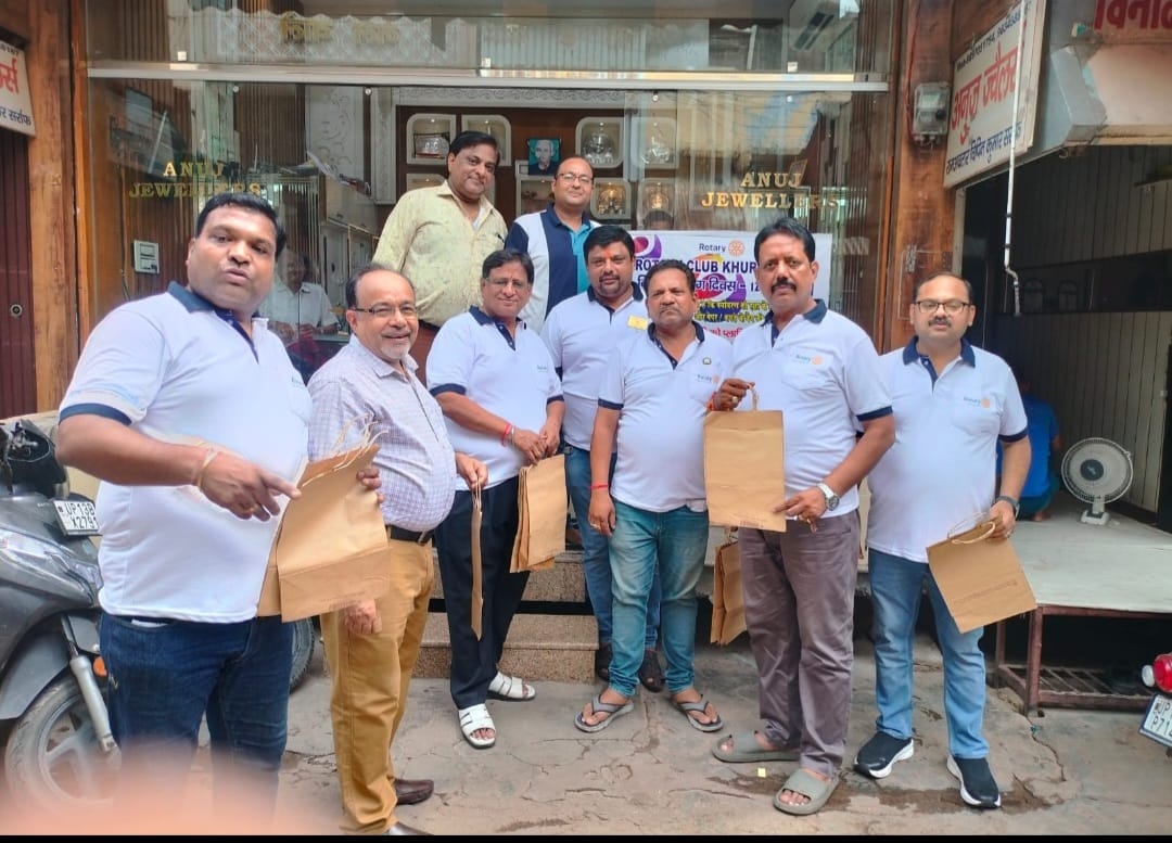 खुर्जा। ।भारत पुष्प। रोटरी क्लब खुर्जा सिटी द्वारा विश्व पेपर बैग डे पर पर्यावरण सुरक्षा के लिए जन जागरण अभियान के तहत नगर के विभिन्न क्षेत्रों में दुकानदारों से वह जनता जनार्दन से पॉलिथीन ना इस्तेमाल करने की अपील की गई दुकानदारों से पेपर बैग या कपड़े के बैग में सामान रख कर देने को कहा गया वह जनता से निवेदन किया गया कि वह प्रयास करें कि घर से थैला लेकर के चलें यह हमारी पौराणिक परंपरा भी है इस अभियान के तहत सब्जी मंडी बाजार बाजार सराफा पसारा बाजार मैं जंन संपर्क किया गया। कार्यक्रम के संयोजक अनुज बंसल रहे। इस दौरान रोहित सिंघल, लितेश्वर शर्मा, अरुण जैन, विवेक अग्रवाल, तरुण बंसल, दीपांशु बंसल, अनुज बंसल, प्रेम प्रकाश अरोरा, अनिल बाठला का सहयोग रहा।