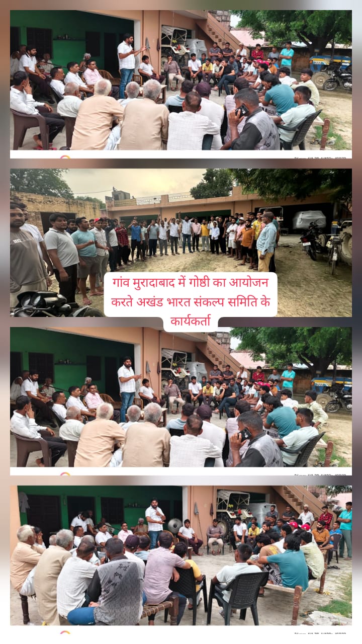 सिकंद्राबाद। ।भारत पुष्प/पवन शर्मा। गांव मुरादाबाद में अखंड भारत संकल्प समिति के तत्वाधान में गोष्ठी का आयोजन किया गया। इस गोष्ठी को संबोधित करते हुए जिला अध्यक्ष रविन्द्र शर्मा ने कहा की इस संकल्प यात्रा में युवाओं को बढ़-चढकर हिस्सा होगा और यात्रा में बड़ी संख्या में सम्मिलित होकर देश को मजबूत व सुरक्षित बनाना है। इस बैठक में युवाओं ने बढ़-चढ़ कर भाग लिया।