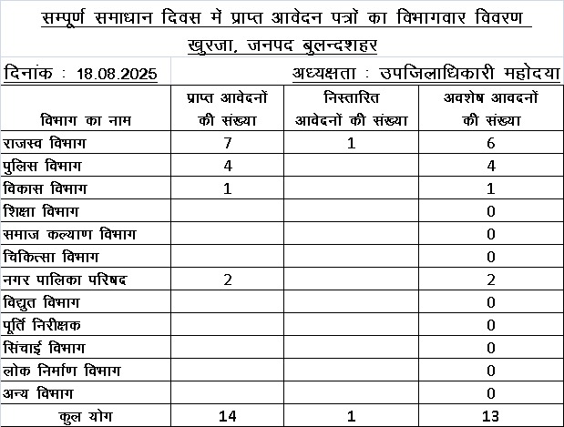 खुर्जा। ।भारत पुष्प। प्रदेश सरकार के आदेश पर चल रहे संपूर्ण समाधान दिवस का आयोजन किया गया। जिसमें कुल 14 शिकायतें विभिन्न विभागों की प्राप्त हुईं। जिसमें से राजस्व विभाग की मात्र एक शिकायत का ही निस्तारण हो सका। शेष सभी 13 शिकायतें विभागों को जल्द से जल्द निस्तारण के लिए भेज दिया गया। संपूर्ण समाधान दिवस की अध्यक्षता एसडीएम प्रतीक्षा पांडे द्वारा की गयी। जिसमें अन्य विभागों के अधिकारी प्रतिनिधि मौजूद रहे। बताया गया कि प्राप्त शिकायतों में राजस्व विभाग की 7 पुलिस विभाग की 4 विकास विभाग की 01 एवं नगर पालिका से संबंधित 02 शिकायतें संपूर्ण समाधान दिवस में रखीं गईं।