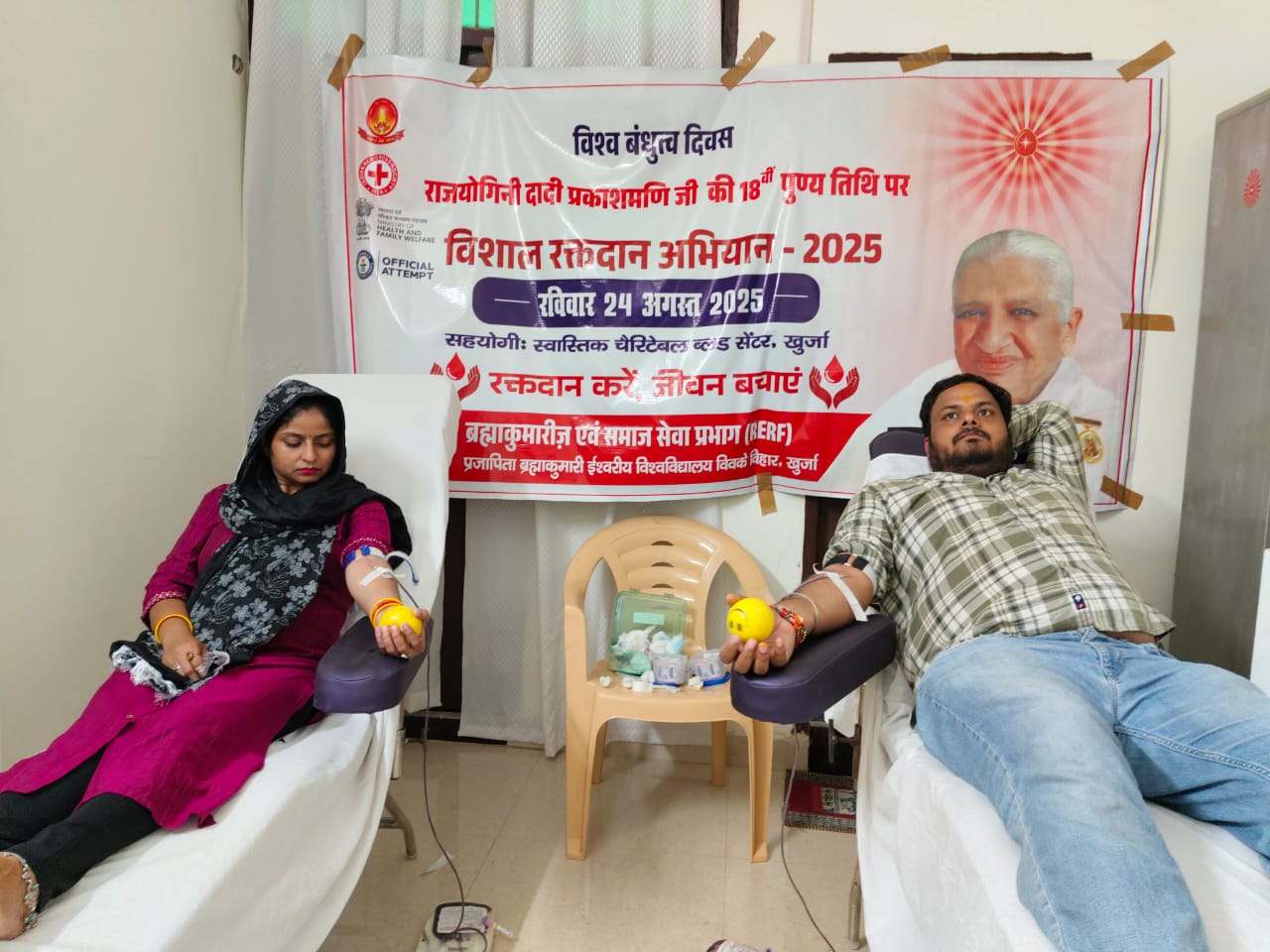 खुर्जा।।भारत पुष्प। ब्रह्माकुमारी संगठन की पूर्व मुख्य प्रशासिका दादी प्रकाशमणि जी की 18वीं स्मृति दिवस पर आज वैश्विक बंधुत्व के रूप में एक रक्तदान शिविर का आयोजन किया गया। यह शिविर प्रजापिता ब्रह्माकुमारी ईश्वरीय विश्वविद्यालय, विवेक विहार खुर्जा के प्रांगण में स्वास्तिक चैरिटेबल ब्लड बैंक, खुर्जा संस्थान द्वारा लगाया गया।