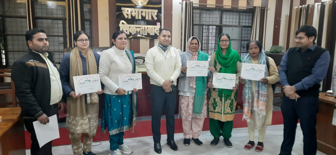 सिकंद्राबाद। ।भारत पुष्प/पवन शर्मा। केंद्र व राज्य सरकार द्वारा SIR यानी गणना करायी जा रही है। यह गणना 4 नवम्बर 25 से शुरु हो चुकी है। सरकार के आदेशानुसार बीएलओ घर-घर जाकर प्रत्येक परिवार के सभी मतदाताओ को गणना पत्र की डबल कोपी देने का आदेश दिया गया है मगर बीएलओ कही पर गणना पत्र की एक ही कोपी दे रहे है ओर कही पर दों कोपी दे रहे है। जिसकी शिकायत नगर एसडीएम को मतदाता कर रहे है। उसी शिकायत को ध्यान में रखकर नगर एसडीएम नगर के बूथों पर जाकर औचक निरीक्षण कर सटीक जानकारी जुटाने में जुटे हुए है और गणना पत्र भरने की विस्तृत जानकारी दे रहे है ओर कुछ महिला बीएलओ मेहनत से कार्य पूर्ण कर चुकी है।  उसी क्रम में सोमवार को सिकंदराबाद एसडीएम ने 05  बीएलओ व सुपरवाइजरों को 100 % गणना पत्र जमा करने पर उनको प्रशस्ति पत्र देकर सम्मानित किया। इस मामले को लेकर जब हमारे संवाददाता ने नगर एसडीएम दीपक पाल से विस्तृत जानकारी जुटाई तो बताया की सिकंदराबाद क्षेत्र मे जो गणना पत्र बीएलओ व सुपरवाइजरों द्वारा वितरण कर भरवाये जा रहे थे उनमें से 02 पुरुष जयकरण, मुकेश व 05 महिला बीएलओ राजकुमारी,नीलम भाटी, अमीता,सरिता मिथलेश ने अपने-अपने क्षेत्र का 100%  कार्य पूर्ण कर संबंधित कार्यालय मे जमा करा दिये गये है। इस क्रम में इन सातों बीएलओ व सुपरवाइजरों को तहसील सभागार में प्रशस्तिपत्र देकर सम्मानित किया गया है।
