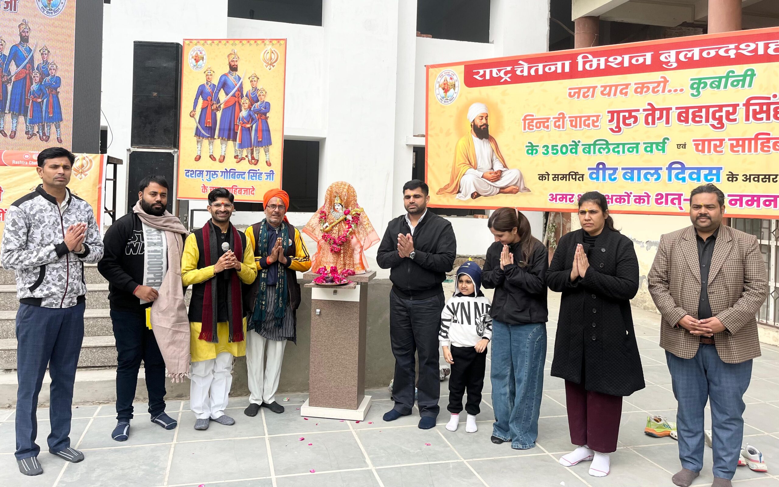 बुलंदशहर। ।भारत पुष्प। गुरु गोबिन्द सिंह जी के चार पुत्रों के अमर बलिदान से स्कूली बच्चों और युवा पीढ़ी को अवगत कराने के लिए राष्ट्र चेतना मिशन का विशेष अभियान लगातार जारी है। छठवें दिन भी सैकड़ों बच्चों को बड़ी एलईडी स्क्रीन एवं साउंड सिस्टम लगाकर एनिमेशन फ़िल्म चार साहिबज़ादे दिखायी गई। शनिवार को सेक्रेड हार्ट्स स्कूल के प्रांगण में आयोजित विशाल कार्यक्रम में मुख्य अतिथि स्कूल ग्रुप डायरेक्टर निर्भय सिंह बेनीवाल एवं सोनाली चौधरी, स्कूल चेयरमैन वेदिका सिंह, प्रिंसिपल अंकित शर्मा, राष्ट्र चेतना मिशन अध्यक्ष हेमन्त सिंह ने माँ सरस्वती, गुरु तेग़ बहादुर, गुरु गोबिन्द सिंह और चार पुत्रों के चित्र के समक्ष दीप प्रज्वलन एवं पुष्पर्चान कर शुभारम्भ किया। संबोधन करते हुए राष्ट्र चेतना मिशन के अध्यक्ष हेमन्त सिंह ने कहा कि मुग़ल काल के दौरान क्रूर अत्याचारी शासक औरंगज़ेब के आदेश पर उसके सिपहसालारों ने हिन्दू और सिखों को धर्म बदलने के लिए बहुत निर्दयता तथा हैवानियत के साथ यातनाएँ देकर हज़ारों लाखों की हत्याएँ की। जबरन इस्लाम अपनाने का दबाव बनाने के लिए बुरी तरह से तड़पाया गया। उन्होंने बताया कि पहले गुरु गोबिन्द सिंह के पिता एवं सिख पंथ के नवम गुरु तेगबहादुर को दिल्ली में गर्दन काटकर हत्या की गई और उसके कुछ साल बाद दशम गुरु गोबिन्द सिंह जी के 2 बड़े पुत्र अजीत सिंह और जुझार सिंह चमकौर के युद्ध में वीरगति को प्राप्त हुए और छोटे 2 पुत्र जोरावर सिंह तथा फतेह सिंह को सरहिन्द के नवाब वज़ीर ख़ान ने ज़िंदा ही दीवार में चिनवाकर मार दिया। ऐसे ही असंख्य लोगों की क़ुर्बानी के बावजूद बहादुर सिख योद्धा अपने धर्म पर डटे रहे और लगातार संघर्ष करते हुए मुगलों के आतंक से देश की रक्षा की। स्कूल कैम्पस में सभी बच्चों को बड़ी एलईडी स्क्रीन और साउण्ड सिस्टम लगाकर एनिमेशन फ़िल्म चार साहिबज़ादे दिखायी गई, 2 घंटे की मूवी में चारों गुरुपुत्रों के जीवन और बलिदान को दर्शाया गया। कार्यक्रम समापन के समय राष्ट्र चेतना मिशन अध्यक्ष हेमन्त सिंह एवं स्कूल डायरेक्टर निर्भय सिंह बेनीवाल ने सिख समाज से पधारे कार्यक्रम के विशिष्ट अतिथि सरदार राजेंदर सिंह, सरदार जसमीत सिंह, सरदार रसजीत सिंह, सरदार अजीत सिंह, सरदार समर्थ सिंह एवं सरदारनी हरप्रीत सिंह को अंगवस्त्र एवं प्रतीक चिह्न भेंटकर अभिनंदन किया। कार्यक्रम की अध्यक्षता करते हुए स्कूल चेयरमैन वेदिका सिंह ने राष्ट्र चेतना मिशन की सराहना करते हुए कहा कि स्कूलों के बच्चों को अपने गौरवशाली और बलिदानी इतिहास से अवगत कराने का प्रयास बहुत ही प्रशंसनीय और प्रेरणादायक है। कार्यक्रम व्यवस्थाओं में वरिष्ठ शिक्षक राहुल भारद्वाज सहित आचार्य कृष्ण मिश