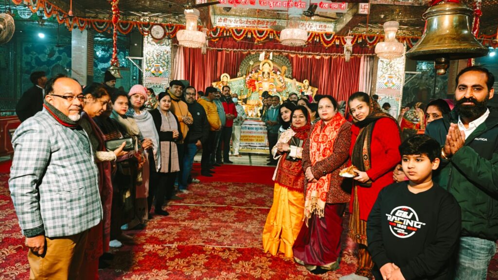 खुर्जा। ।भारत पुष्प। नव वर्ष 2026 पर रोटरी क्लब खुर्जा सिटी ने अपने सदस्यों के लिए विशेष दर्शन आरती और प्रसाद वितरण कार्यक्रम श्री नवदुर्गा शक्ति मंदिर पर रखा। कार्यक्रम का शुभारंभ आधे घंटे के सुंदर कांड में हनुमान जी की आरती उपरांत जुगल जोड़ी सरकार मंदिर दर्शन प्रांत माता रानी के भवन में अपने देश और देशवासियों के लिए ईश्वर से वैभव, ऐश्वर्य, उन्नति, प्रगति, प्रसिद्धि, समृद्धि एवं स्वास्थ्य निरोगिता दीर्घायु की कामना की प्रभु सभी को सद्बुद्धि सद्विद्या सदविवेक शब्द संपन्नता प्रदान करेंl विश्व शांति के लिए विश्व शांति के लिए 1 मिनट का मौन रखा गया l
