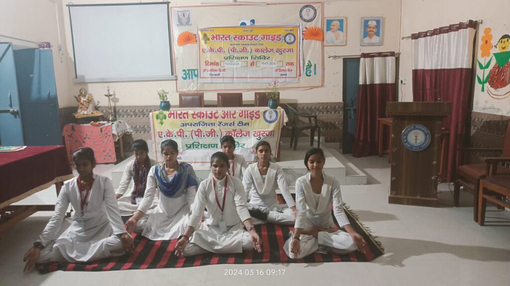 खुर्जा। ।भारत पुष्प। एकेपी डिग्री कॉलेज में रोवर एंड रेंजर्स प्रशिक्षण के तृतीय दिवस रेंजर्स प्रभारी डॉ अनामिका द्विवेदी एवं डॉ मनु आर्या एवं प्रशिक्षक अमित प्रताप व अंशु के दिशा निर्देशन के द्वारा रोवर रेंजर्स की छात्रों को बी पी सिक्स एक्सरसाइज बताते हुए ध्वज शिष्टाचार का प्रशिक्षण दिया गया। इसके पश्चात झंडा गीत, प्रार्थना के साथ ‘सर्वधर्म सभा’ का आयोजन किया गया। साथ ही पुष्प वाटिका को तैयार किया गया ,जिसमें विभिन्न पौधे लगाए गए।