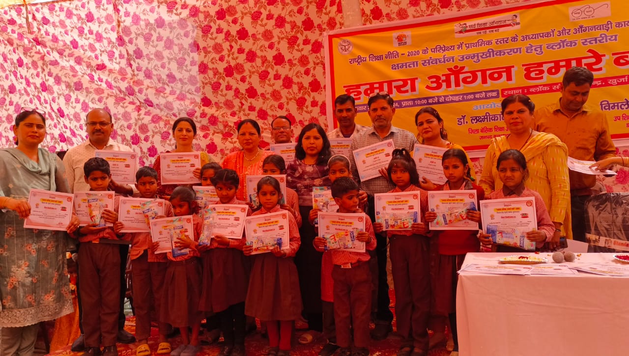खुर्जा। ।भारत पुष्प। ब्लॉक संसाधन केंद्र खुर्जा राष्ट्रीय शिक्षा नीति 2020 के परिप्रेक्ष्य में प्राथमिक स्तर के प्रधानाध्यापकों एवं आंगनबाड़ी कार्यकतियों की क्षमता उन्मुखीकरण हेतु ब्लॉक स्तरीय हमारा आंगन हमारे बच्चे का कार्यक्रम आयोजित किया गया। हमारा आंगन हमारे बच्चे कार्यक्रम का शुभारंभ खंड शिक्षा अधिकारी कुसुम सिंह ने फीता काटकर एवं सरस्वती मां के समक्ष फूल अर्पित कर किया। साथ ही खंड शिक्षा अधिकारी ने बाल वाटिका एवं निपुण बच्चे व आंगनबाड़ी कार्यक्तियों को सर्टिफिकेट देकर सम्मानित किया। खंड शिक्षा अधिकारी कुसुम सिंह ने कहा कि आंगनबाड़ी कार्यकर्ती गुरु माता का रूप होती हैं और सभी अध्यापक गण एवं आंगनबाड़ियों का आभार व्यक्त करते हुए धन्यवाद किया और उनके कार्य को सराहा। कार्यक्रम का संचालन पंकज तायल एवं अर्चना रघुवंशी ने किया। कार्यक्रम में रामवीर सिंह ,मेघ दत्त शास्त्री,रोरम सिंह, खान चंद देशराज सिंह,गजराज सिंह, विपिन कुमार, भूपेंद्र कुमार, समरीता पालीवाल, शैली, नितिन शर्मा, सिंह,नीलम, खुशबू ,सोनू शर्मा, यशवंत सिंह,योगेश भाटी,योगेश जोशी,अमर सिंह, सौरभ भास्कर ,प्रवीण शर्मा आदि लोग व्यवस्था में उपस्थित रहे।