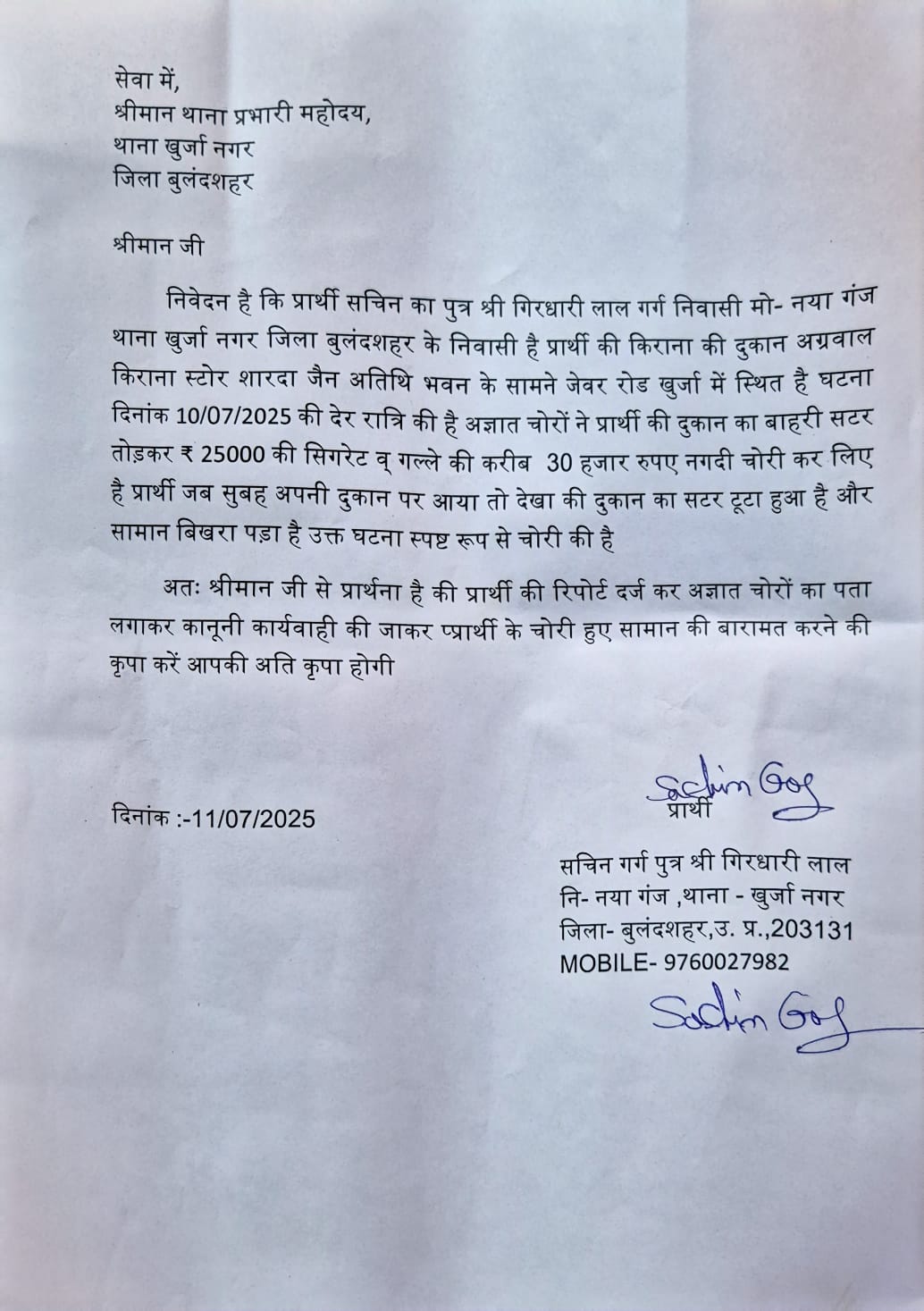 खुर्जा। ।भारत पुष्प। कोतवाली नगर क्षेत्र के जंक्शन रोड स्थित शारदा मैरिज होम के सामने अग्रवाल किराना स्टोर की दुकान का शटर तोड़कर चोरों ने हजारों रुपए की नगदी व…